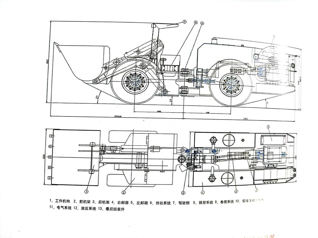 WZD-100C)型地下柴油裝運機包括前機架和后機架,中間部位用鉸接軸連接。前機架裝有工作機構、前驅動橋、轉向機構、工作操縱機構、行走調速控制機構、駕駛室等。后機架裝有電動機、靜液壓傳動系統、液壓卷纜機構、電器箱、減速器、后驅動橋,后端蓋,油泵驅動機構等,其總體結構見圖: