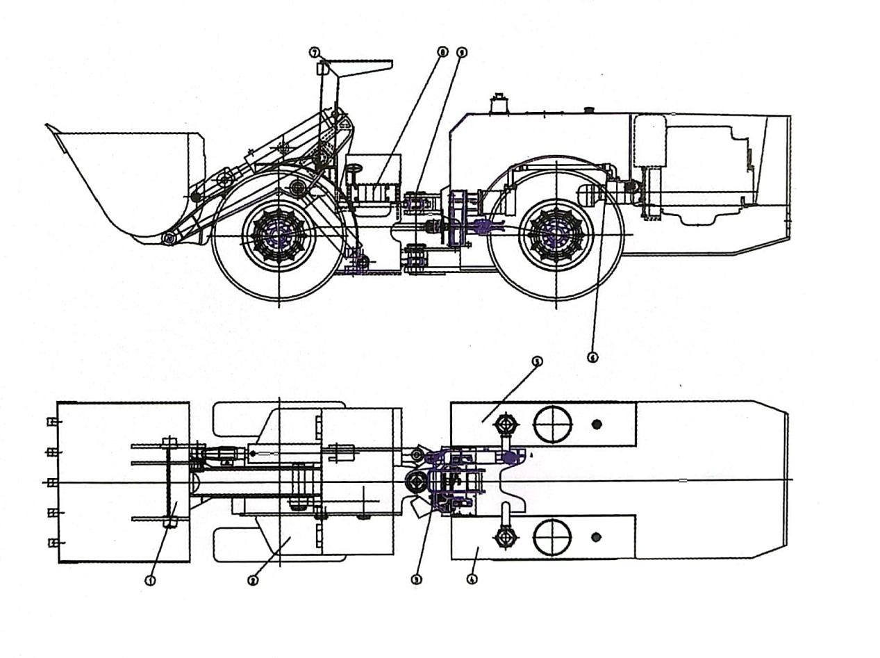 WZD-100型地下電動裝運機包括前機架和后機架,中間部位用鉸接軸連接。前機架裝有工作機構、前驅動橋、轉向機構、工作操縱機構、行走調速控制機構、駕駛室等。后機架裝有電動機、靜液壓傳動系統、液壓卷纜機構、電器箱、減速器、后驅動橋,后端蓋,油泵驅動機構等,其總體結構見圖: